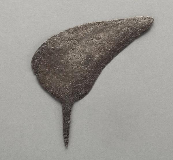 Lama di coltello dalla forma a becco d'uccello, dalla sagoma fondamentalmente triangolare con il lato superiore e posteriore convessi e quello inferiore concavo. Breve codolo a spuntone.