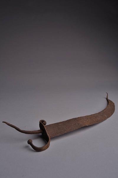 Lama di coltello o piccola daga. Breve e fine codolo di sezione quadrangolare sul quale è incastrato un guardiamano sinuoso a due bracci incurvati terminanti a ghianda: un braccio più breve curva quasi ad angolo retto e si protende verso la lama, dalla parte opposta, uno più lungo si protende nella direzione contraria, a protezione delle dita. la lama, priva di filo, è breve, molto curva e si rastrema verso la punta, acuta. Su entrambi i piani, incisione a cesello e agemina di rame a motivo di serpente che mostra la lingua (?). Il disegno interessa il medio, segue il dorso e sottolinea le due concavità praticate su quest'ultimo, inframmezzate da una serie di piccole tacche.