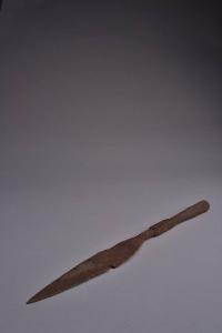 Gorbia troncoconica che prosegue in un breve collo tubolare intervallato da una breve espansione a parallelepipedo rettangolare in prossimità della lama, caratterizzata da zigrinature a V rovesciata e delimitata da due rilievi anulari. Lama a foglia leggermente crestata.