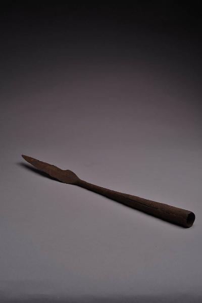 Ferro di lancia con cuspide a foglia allungata e leggermente crestata al centro di entrambi i piani, con lunga gorbia troncoconica aperta.