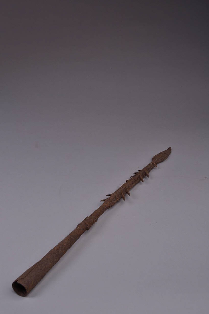 Ferro di lancia con lunga cuspide a foglia dalla forma fine e allungata e leggermente tondeggiante alla base, crestata al centro. Gorbia troncoconica.