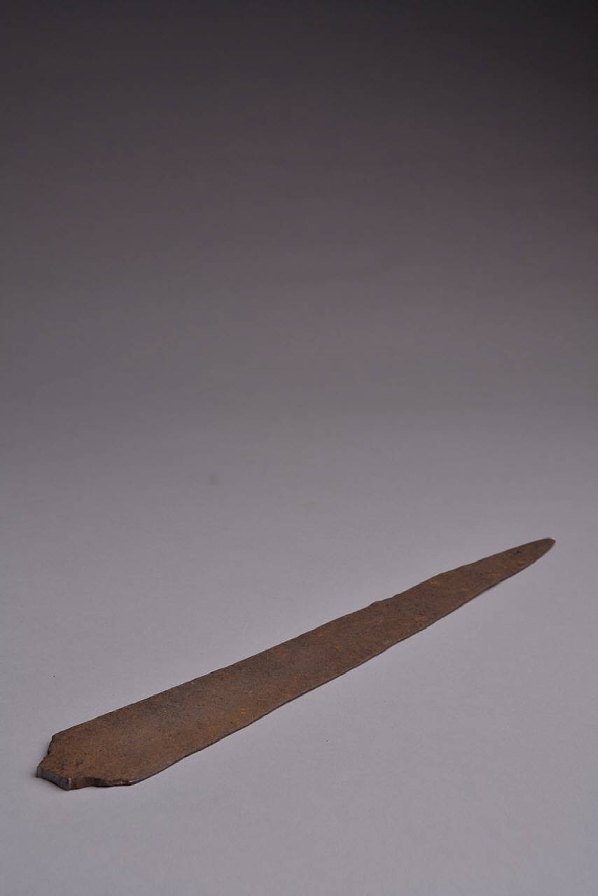 Lama triangolare con doppio filo, sottile, leggermente crestata, con due sgusci al centro della lama che occupano il medio e pate del tallone e del debole. I due sgusci, separati da una nervatura centrale si uniscono a punta acuta verso la punta della lama. Sotto gli sgusci, al centro del tallone, una incisione cruciforme con estremità biforcute. Lungo e fine codolo centrale di sezione quadrangolare leggermente espanso verso la lama.