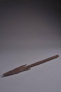 Ferro con lunga gorbia cilindrica aperta terminante nella nervatura centrale della cuspide, triangolare, ad arpione, con alla base due alette appuntite.