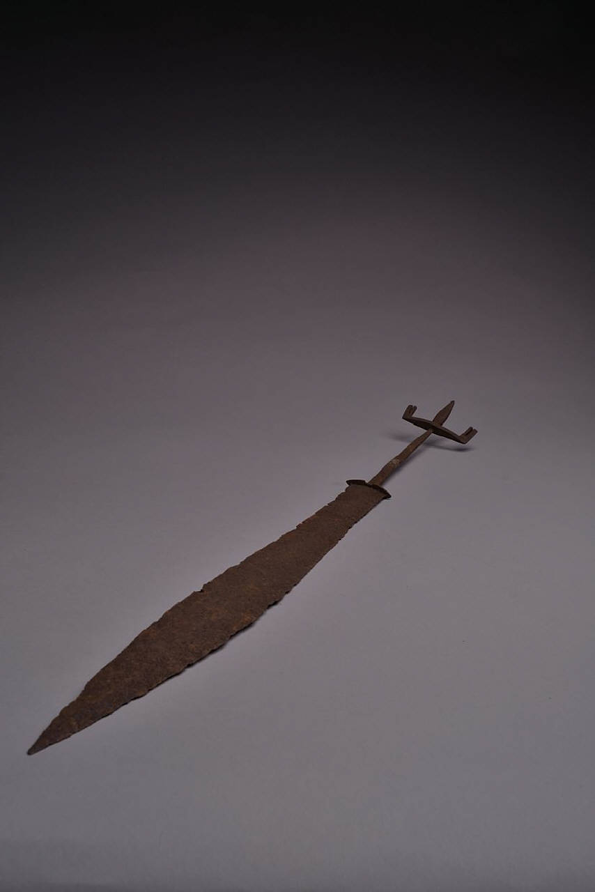 Lunga lama sottile, crestata, a due fili che scorrono leggermente concavi nel forte e convessi fra medio e debole e terminanti a punta acuta. Lungo e fine codolo quadrangolare centrale terminante in un pomolo leggermente romboidale con una guglietta centrale a ogiva e due estremità biforcute piegate nella stessa direzione.
