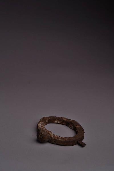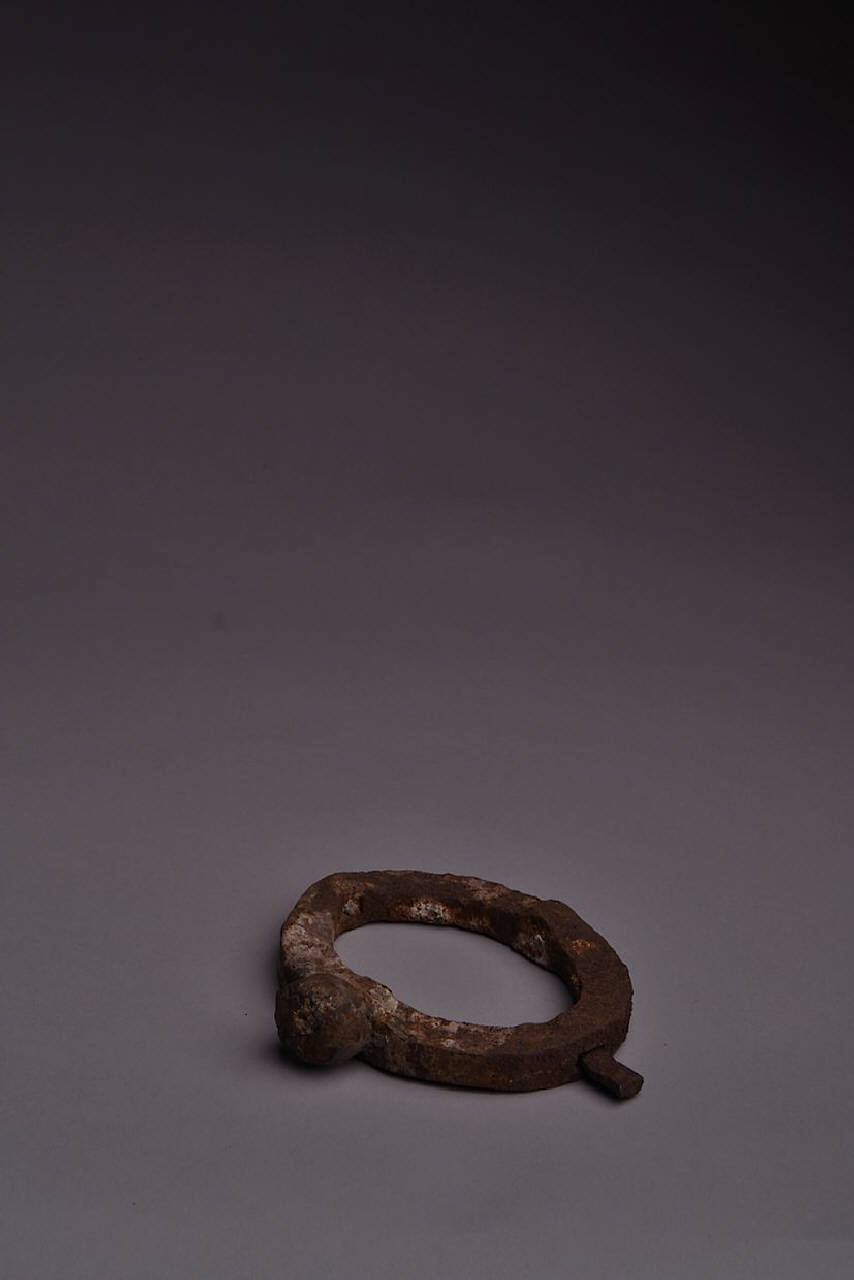Anello di catena circolare leggermente schiacciata, di sezione quadrangolare, con saldati al perimetro una sfera e, a un quarto del giro, un piccolo cuneo.