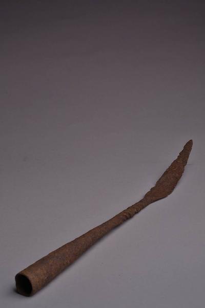 Ferro di lancia con gorbia troncoconica aperta, lungo collo a torciglione nella zona vicino alla cuspide dalla forma di lunga foglia crestata.