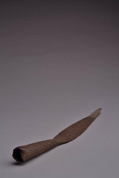 Ferro di lancia con gorbia troncoconica aperta e cuspide a lunga foglia crestata espansa alla base e rastremata al terzo.