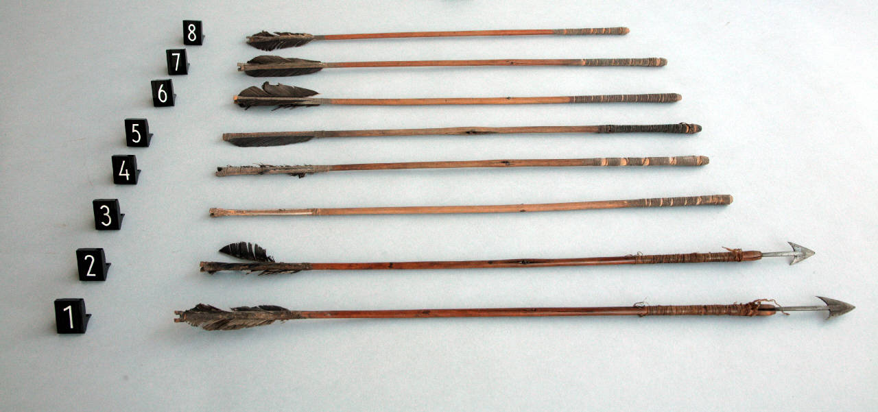 Freccia senza cuspide e con poche piume direzionali. Fa parte di un gruppo di 8 piccole frecce somale. Probabilmente quelle senza cuspide, non avendo il foro per ospitare il codolo, sono incomplete. La forma e la fattura sono uguali, ma sembra che il legno utilizzato sia diverso fra quelle con cuspide, che hanno una patina più antica, e quelle che ne sono sprovviste, che hanno invece una patina più chiara, dall'aspetto più recente.
