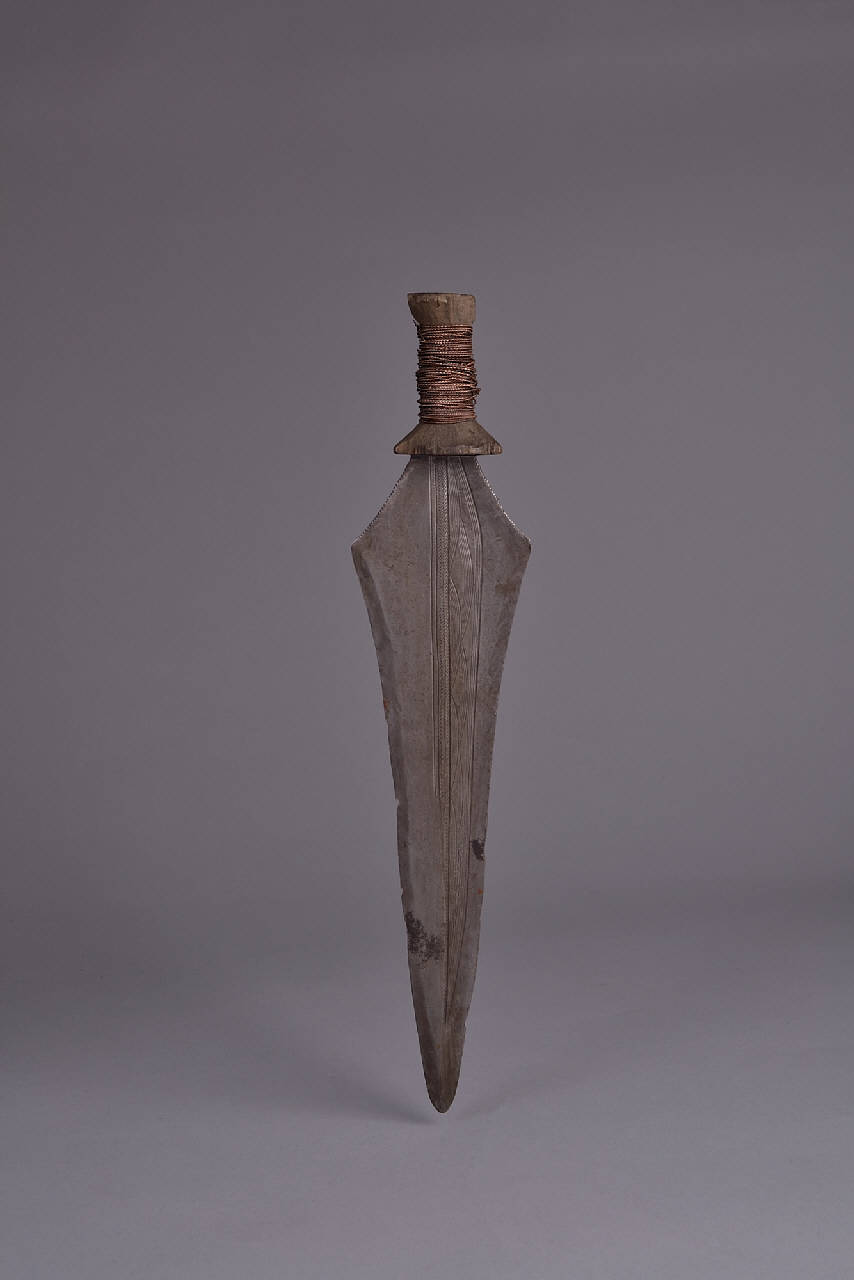 Piccola impugnatura in legno pressappoco circolare, rastremata al centro, avvolta da cordellina di rame. La lama si espande al forte, con i bordi superiori leggermente concavi e zigrinati, per restringersi triangolarmente con i due fili che convergono nella punta acuta. La zona delimitata dagli sgusci che scorrono al centro e da quelli sulla destra, è decorata di fini striature.