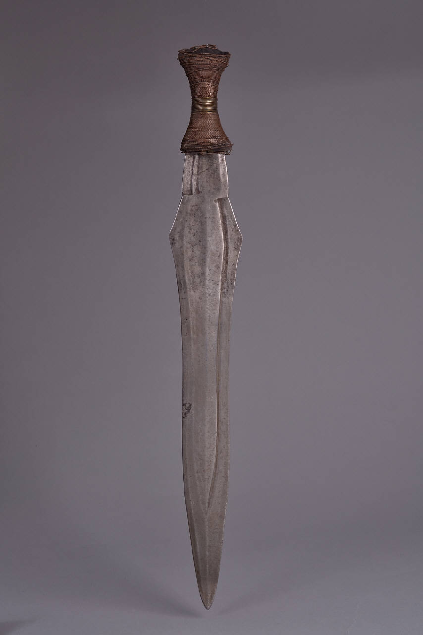 Daga congolese con impugnatura in legno poroso in parte annerito, strozzata al centro e ricoperta completamente da cordellina di rame fissata ai bordi da quattro fettucce dello stesso materiale (che in parte hanno ceduto), con al centro una banda di filo d'ottone. La lama presenta al forte una piccola sezione dal profilo bombato con due sgusci sulla sinistra, prosegue nel forte con un'altra sezione a cresta centrale costituita da alette triangolari sporgenti e, dal medio al debole, con i due fili che convergono dolcemente verso la punta espandendosi leggermente nel debole. Questa sezione è caratterizzata da un forte sguscio sul lato destro e da una leggera cresta alla sinistra, che segue lo stesso profilo.