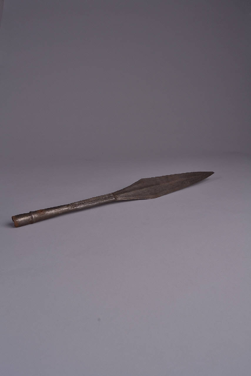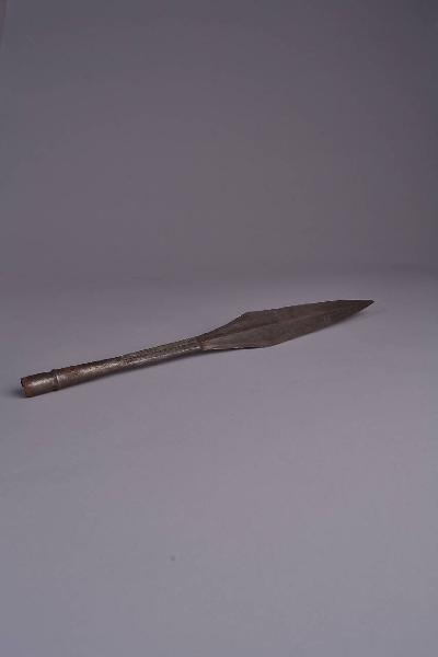 Ferro di zagaglia con gorbia cilindrica aperta, con foro per l'attacco all'asta e anellatura vicino all'imboccatura. Residui di legno tarlato, all'interno. Collo schiacciato, con sguscio centrale e incisioni opposte a doppia V alle due estremità. Cuspide romboidale con due lati più lunghi e cresta centrale delimitata alla sinistra da una depressione che prosegue fino al filo.