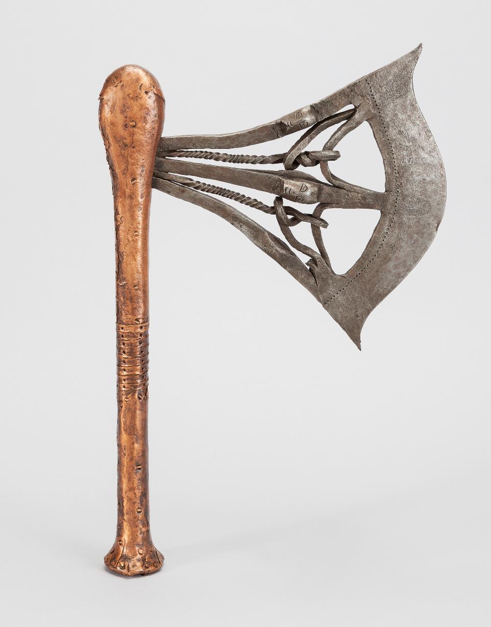 Asta in legno sbozzata a clava, con fondo a cono, ricoperta interamente di lamierino di rame fissato da tasselli dello stesso materiale. Ferro incastrato nell'espansione bulbosa dell'impugnatura che si espande dall'asta con due bracci laterali e uno centrale che terminano sulla lama a filo convesso frontale. All'interno dei tre bracci principali, che presentano nel mezzo delle sagome di teste (o delle piccole maschere), si intrecciano altri bracci più piccoli, curvi e tortili, che si intrecciano all'interno. La zona frontale è decorata con una fila di quadratini punzonati.