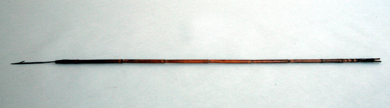 Freccia ad arpione con cuspide metallica di sezione quadrata dalla cui estremità inferiore scende un breve spuntone. Asta di bambù con avvolgimento di cordino di pelle all'attacco del codolo e cocca profonda e biforcuta.