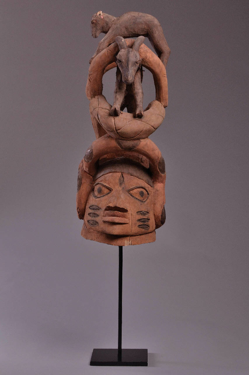MASCHERA. Sopra la testa sono intagliati, tra l'altro, tre serpenti e due capre; la maschera è monocroma marrone.