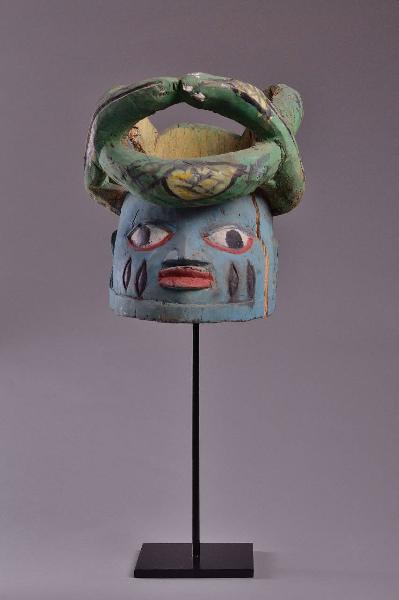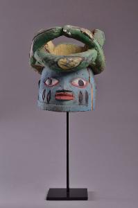 MASCHERA. Sopra la testa, blu, è intagliato un serpente verde.