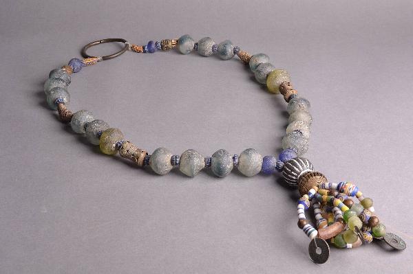 COLLANA per il mercato dell'esportazione di perle di vetro e lega di rame; le perle di vetro sono di due qualità: perle a base di vetro riciclato in pezzi di colore verde, blu, marrone e perle da polvere di vetro in colore blu (powder glass). Il pendente è formato da una conteria dipinta e da una di rame lavorato da cui dipartono fili ad anello con perle da polvere di vetro policrome, semi e monete di rame; un elemento oblungo è di coppale. Un anello apribile fa da chiusura della collana.