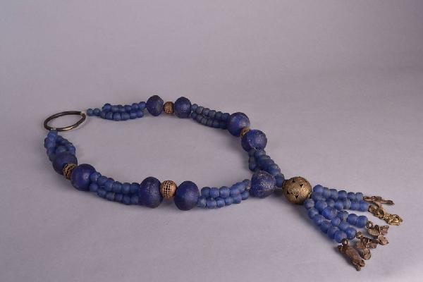 COLLANA per il mercato dell'esportazione con quattro conterie in lega di rame lavorato; dall'anello alla prima e tra l'una e l'altra vi è una perla di vetro blu da cui dipartono tre fili di perle più piccole di vetro riciclato blu; il pendente è formato da una piccola perla blu e una conteria di rame lavorato da cui dipartono cinque fili di perle blu portanti ognuna una figura zoomorfa in lega di rame. Un anello apribile fa da chiusura della collana.