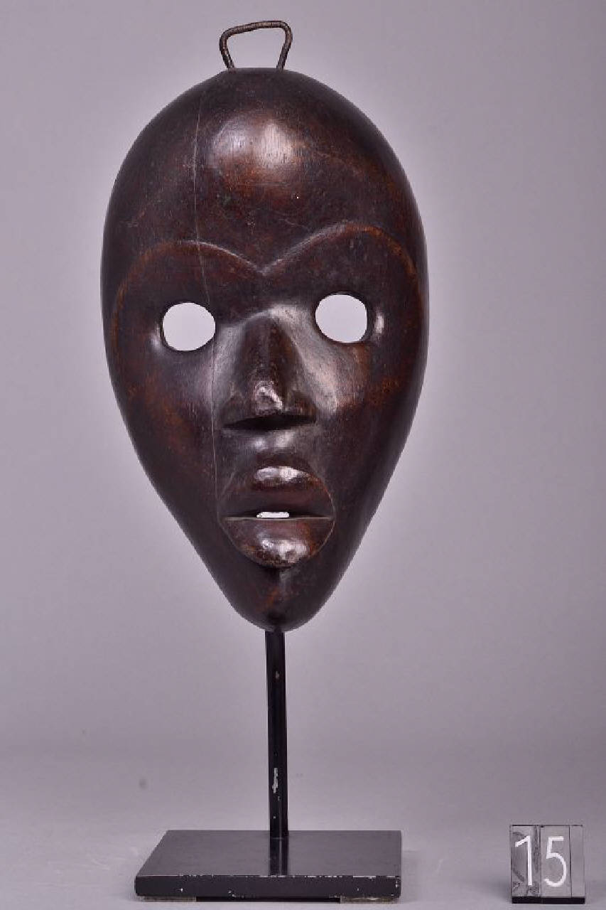 MASCHERA ZAKPAI GA - Maschera facciale antropomorfa di forma ovale con ampia fronte bombata e terminazione inferiore appuntita. Grandi cavità oculari circolari, ampio naso e bocca carnosa semiaperta.
