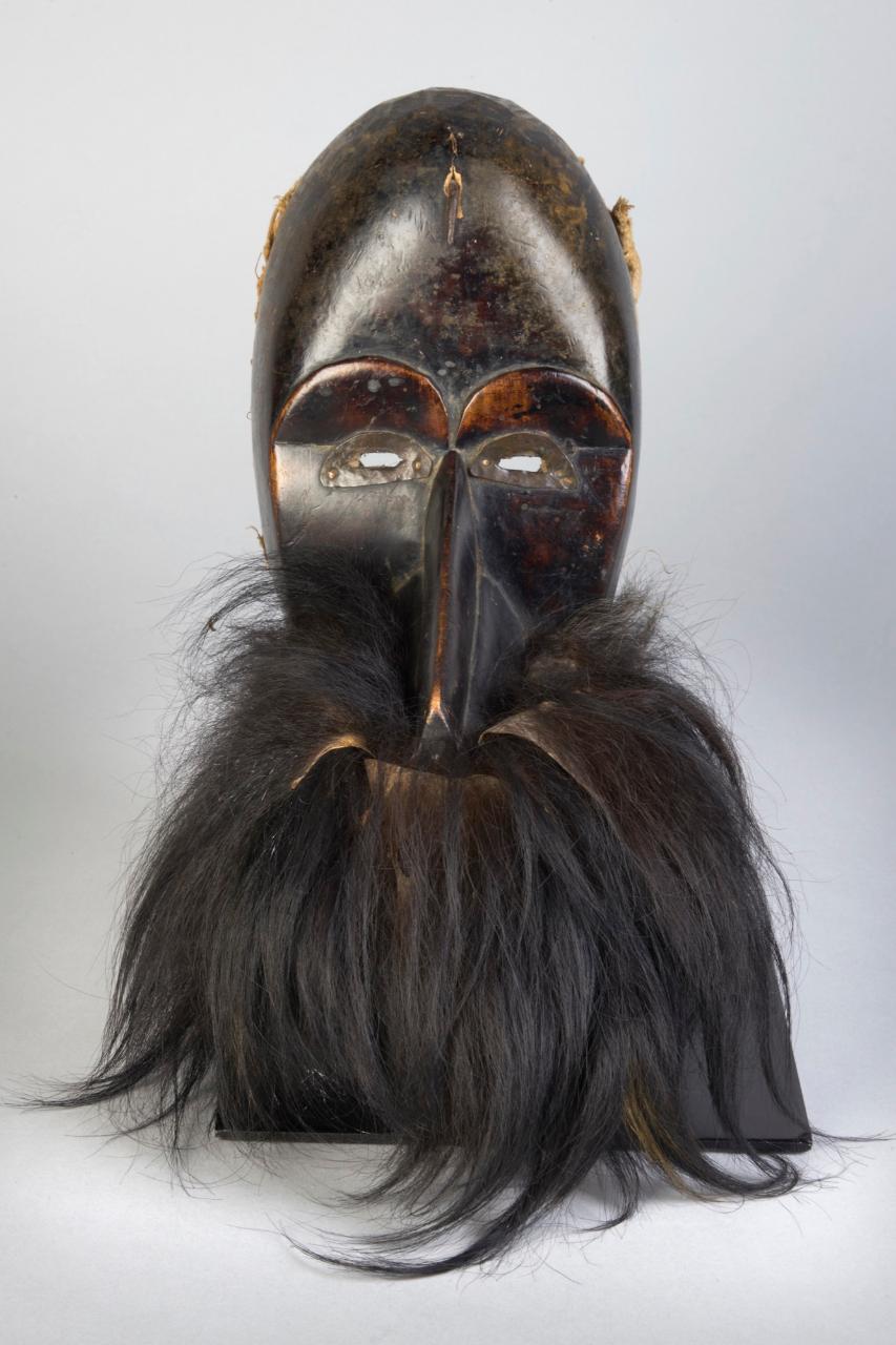 MASCHERA ZOOMORFA GEGON - Maschera di superficie scura, dal volto ovale, ampia fronte bombata e occhi a fessura; al lungo becco sporgente cui è agganciato del pelo di scimmia.
