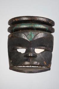 MASCHERA IDIOK EKPO - Maschera facciale antropomorfa a mascella mobile tinta in nero e in verde. I volumi sono massicci, caratterizzati dalla pesante arcata sopraccigliare, ripresa dalle due fasce poste sopra la testa, dal largo naso e dai grandi occhi forati che come la bocca attraversano tutto il volto fino ai lati.