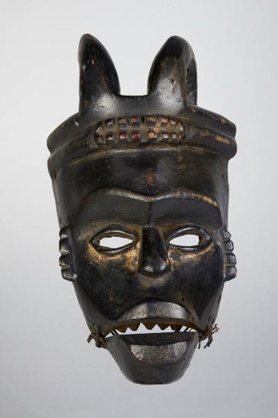 MASCHERA IDIOK EKPO - Maschera facciale antropomorfa a mascella mobile, tinta in nero. Sulla sommità corna curvate all'indietro che che si ricongiungono al piano della testa. In alto, sopra la fronte e ai lati, all'altezza degli occhi, motivi cheloidali (scarificazioni). Il volto è più allungato e presenta tratti più sottili rispetto a molte altre maschere della stessa tipologia che invece tendono a raffigurare il volto attraverso volumi massicci che conferiscono alla maschera un'espressione terrificante.