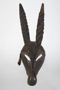 MASCHERA FACCIALE ZOOMORFA - La maschera presenta un muso allungato che si assottiglia procedendo in direzione della bocca. Le lunghe corna leggermente divaricate, gli occhi a mandorla disposti obliquamente e le linee che dall'attaccatura delle corna convergono verso le narici enfatizzano lo sviluppo longilineo della maschera.