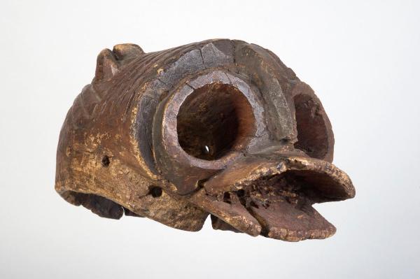 MASCHERA ZOOMORFA di forma cilindrica portata orizzontalmente sulla testa. Di forma cilindrica sono anche il muso (deteriorato) e i grandi occhi cavi separati da una cresta che dalla fronte scende sul muso. Sulla sommità della maschera, nella parte retrostante, piccole orecchie volte all'indietro. Il danzatore vede dall'apertura della bocca.