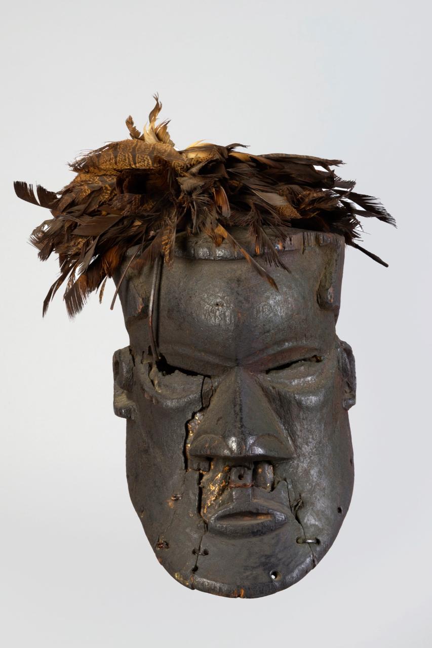 MASCHERA MBWOOM - Maschera di colore scuro con acconciatura di piume di uccello. La fronte è bombata, gli occhi sottolineati da pesanti borse, tagliano orizzontalmente il volto arrivando fino alle orecchie. Il naso a base triangolare presenta larghe narici, mentre la bocca ellittica è di piccole dimensioni.