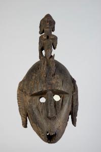 MASCHERA DYOBOLI Sulla testa è seduta una figura femminile; la fronte bombata termina con la linea diritta dell'arcata sopraccigliare sotto la quale stanno gli occhi, rotondi e forati. Il piano del volto di forma triangolare e mento appuntito (deteriorato) è tagliato verticalmente dal setto nasale. Ai lati scendono due trecce spiraliformi che partono da dietro le orecchie sporgenti.