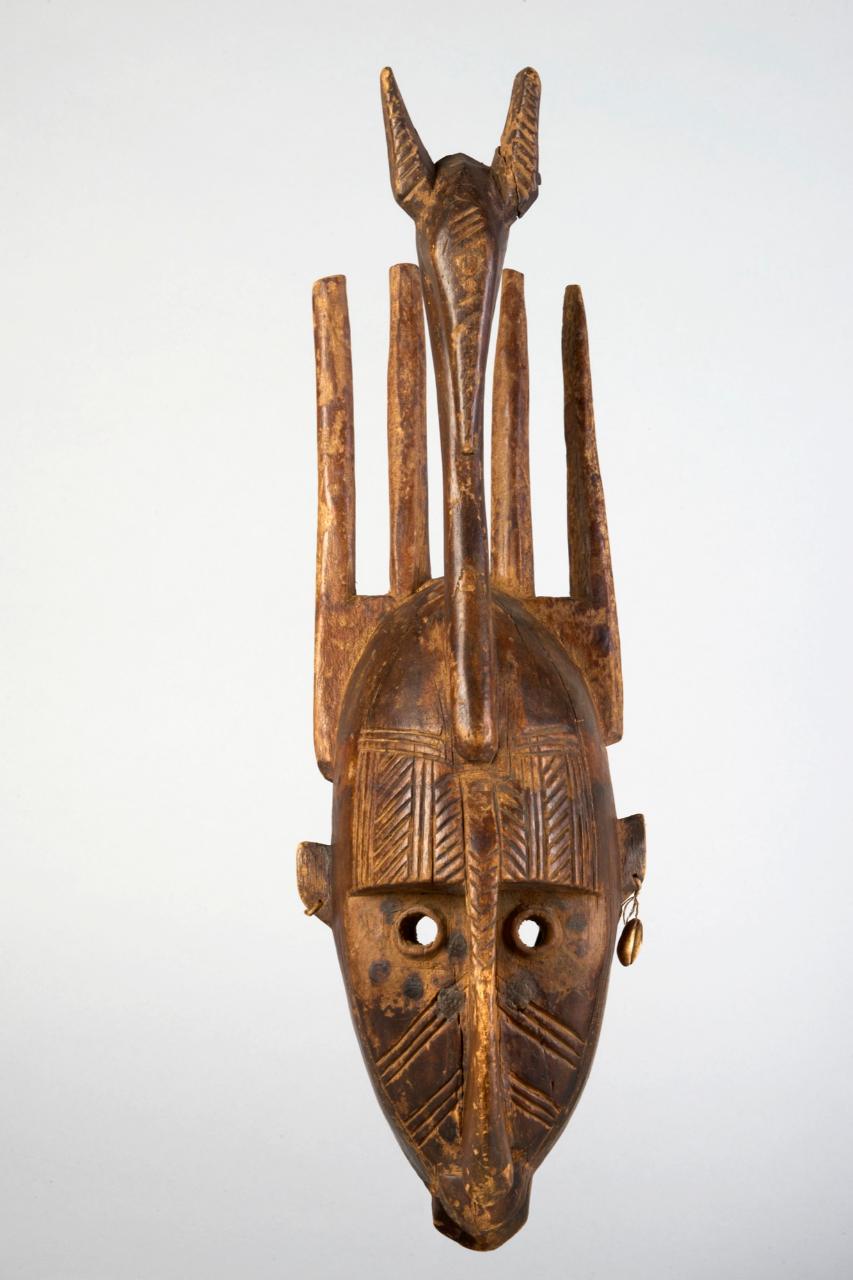 MASCHERA NTOMO - maschera facciale antropozoomorfa con volto di forma ellissoidale sormontato da una testa di antilope e quattro corna. La linea verticale del collo dell'animale si prolunga lungo il setto nasale del volto sottostante dividendo la maschera in due metà simmetriche. Occhi rotondi forati, orecchie laterali sporgenti, incisioni sul volto e sulle corna dell'antilope.