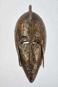 MASCHERA DYOBOLI - Maschera lignea ricoperta di placche di ottone. Ampia fronte bombata con acconciatura a cresta e due trecce laterali. Volto triangolare con terminazione a punta. Elemento caratterizzante è il lungo e sottile setto nasale che incrocia la perpendicole degli occhi a fessura con palpebre abbassate.