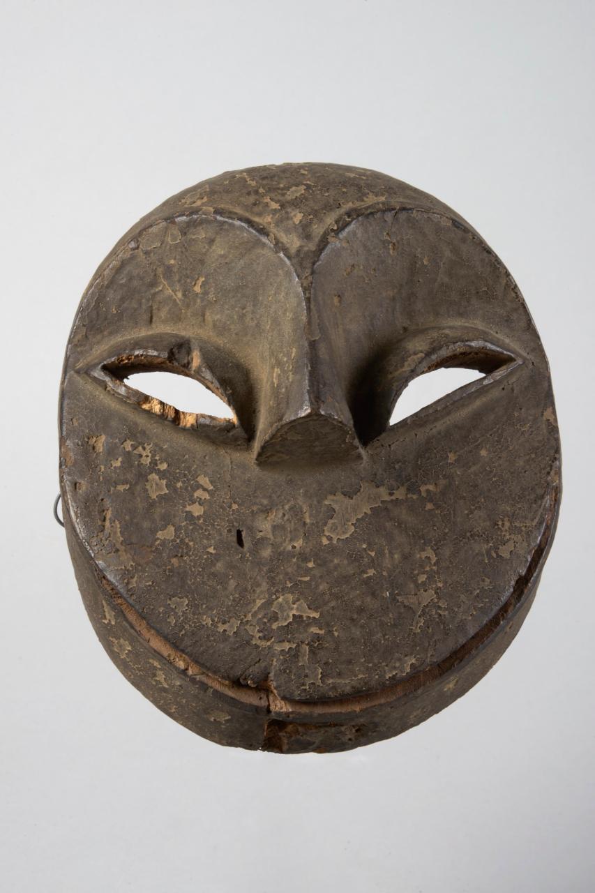 MASCHERA MWISI GWA SO'O - Maschera facciale zoomorfa (scimpanzé) di forma discoidale e piatta, caratterizzata dall'ampia arcata sopraccigliare, da grandi occhi a mandorla forati e obliqui, convergenti al centro. Il naso inusitatamente breve resta all'altezza degli occhi, lasciando vuoto lo spazio sottostante della maschera. Anche la bocca non è incisa sul piano ma al di sotto dell'estremità inferiore.