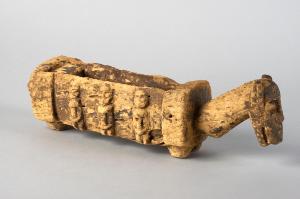 RECIPIENTE RITUALE di forma rettangolare poggiante su quattro piedini circolari. Presenta figure antropomorfe scolpite sulle pareti e impugnature zoomorfe ai lati (testa e coda di cavallo). Superficie consunta.