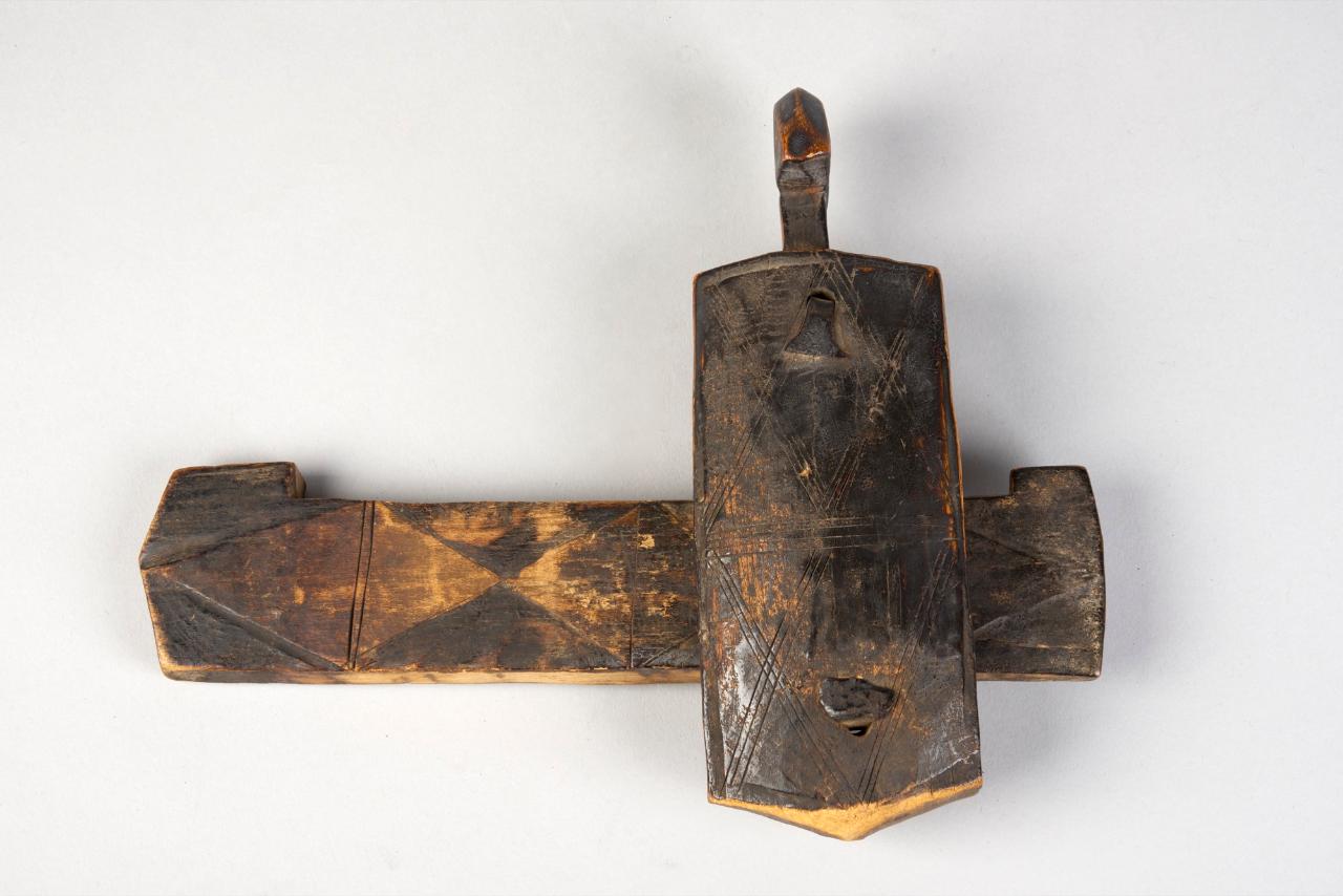 SERRATURA (ta koguru) composta da un corpo verticale (ta koro) da fissarsi alla porta e terminante con una testa antropomorfa e una parte orizzontale mobile (chiavistello, ta dagu) che passa attraverso un'area rettangolare incisa nella parte restrostante dell'elemento verticale per poi conficcarsi in un buco nel muro. La chiusura è assicurata con due elementi metallici che a partire dall'alto vengono infissi in fori ricavati nel chiavistello.