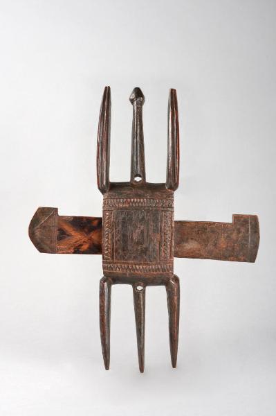 SERRATURA (ta koguru) composta da un corpo verticale (ta koro) da fissarsi alla porta e una parte orizzontale mobile (chiavistello, ta dagu, qui mancante) che passa attraverso un'area rettangolare incisa nella parte restrostante dell'elemento verticale per poi conficcarsi in un buco nel muro. La chiusura è assicurata con due elementi metallici che a partire dall'alto vengono infissi in fori ricavati nel chiavistello. \nLa serratura assume una chiara identità antropomorfa data dalle tre proiezioni superiori (braccia e collo con testa) e da quelle inferiori (gambe e pene). La parte centrale corrispondente al busto e al ventre è incisa con motivi a zig zag e motivi lineari incrociati.