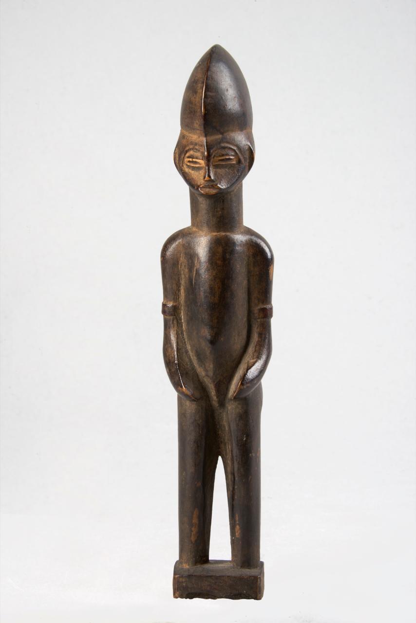 STATUA ANTROPOMORFA in posizione eretta con gambe cilindriche leggermente divaricate, braccia che scendono aderenti al corpo e poi curvano in direzione dell'ombelico con grandi mani a spatola (dita non segnate). Se le spalle sono strette e curve, il collo è invece rigido e forte. La testa ha grande acconciatura cupoliforme attraversata da una linea sagittale e presenta un volto cuoriforme, attraversato da una linea che senza soluzione di cotinuità va dall'arcata sopraccigliare alla bocca, disegnando il tipico prognatismo dello stile senufo.