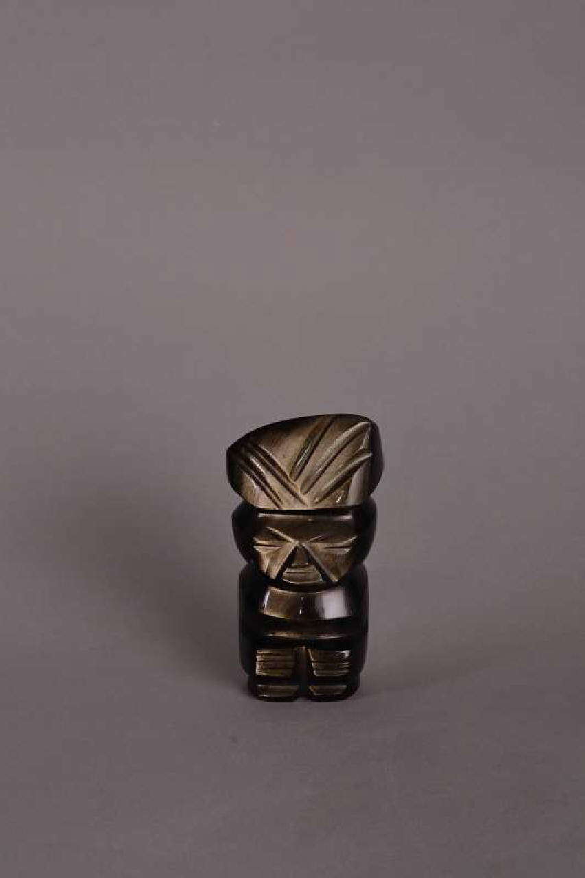 Statuetta moderna in ossidiana verde realizzata mediante intaglio con strumenti a motore. Raffigura un individuo stante con sopricapo e braccia conserte.