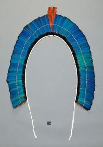 Diadema occipitale a ruota. Il supporto di cotone è costituito da numerose cordicelle tenute insieme da un'altra corda che oltre a riunirle fissa le penne e le piume. Le penne e le piume sono disposte su due file distinte. La prima fila è costituita da circa 300 piumette nere di cm 2,5. Nella seconda fila il numero totale di penne é di 262, di cui 4 rosse, 2 rosse anche sul retro, 2 con il retro blu, alte 27 cm con la punta tagliata . Le restanti 258 sono azzurre con il retro sfumato giallo e rosso e sono alte cm 18. Da destra a sinistra sono così disposte: 123 penne azzurre, le otto penne rosse e 135 penne azzurre. A circa 10 cm dal supporto c'è un'altra cordicella che tiene unite le penne.Si fissa ad un supporto di fibre di palma buritì tramite l'uso di appositi lacci.