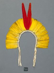 - NOTIZIE STORICO CRITICHE oggetto prodotto all'interno di un gruppo di etnia Kayapò risiedente nello stato di Goias in Brasile come appare nella documentazione di accompagnamento alla collezione.\nOrnamenti di queste dimensioni inferiori sono usati esclusivamente dagli uomini che abbiano preso parte a qualche rituale o che l'abbiano ricevuto in eredità o per priviliegio. Il privilegio si ottiene alla nascita nel momento in cui il neonato riceve un certo numero di nomi, cui di norma sono legati dei privilegi come quelli di indossare certi ornamenti, di dipingersi in un certo modo, di mangiare certi tipi di carne, di confezionare certi ornamenti, di parlare di determinati argomenti etc. L'insieme di questi privilegi si definisce "nekrex", ovvero "la ricchezza di uno", termine che si applica anche al possesso di beni materiali.\nSono presenti in tutti i villaggi kayapò. Si usano senza strutture di supporto, legati direttamente alla testa con gli stessi capi di cotone che tengono insieme le piume. Sono confezionati anche per i bambini ma solo a scopo estetico.