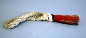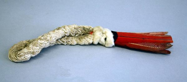 Ornamento brachiale di cotone, penne e piume. E' costituito da u un ciuffo di 9 penne rosse di cm 17, tenute insieme da una sorta di anello di cotone (h. 5,5 cm) da cui è separato attraverso un giro di piume nere (h. 4 cm).