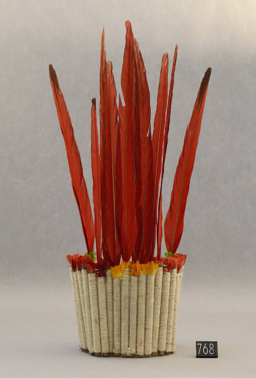 Diadema verticale realizzato con penne e piume di Ara macao. Corona composta da 27 tubi di canna di bambù avvolti in filo di cotone. In cima ad ogni tubo sono infilate 4 piume, due a ogni estremità, 5 gialle al centro e le restanti 18 sono rosse. La decorazione é completata da 10 lunghe penne rosse, 8 al centro e una a ogni estremo, infisse nei tubi di canna.