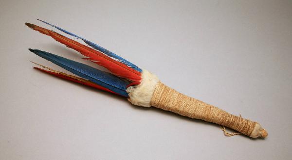Sonaglio con manico di bambù rivestito di fibra e decorato con sei penne rosso-blu.