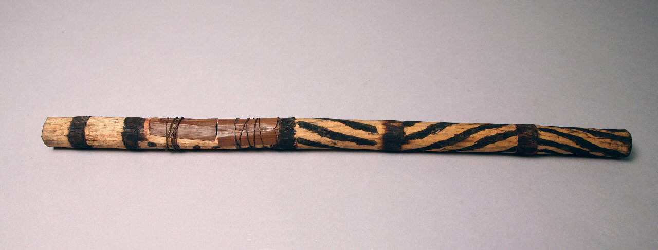 Flauto in legno decorato con motivi geometrici dipinti con pigmento nero. Due piccoli pezzi rettangolari di corteccia, fissati con filo di cotone, coprono il foro per l'emissione del suono e l'area subito al di sotto.
