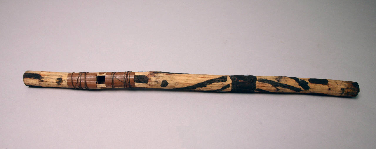 Flauto di legno decorato con motivi geometrici dipinti di pigmento nero. Due piccoli pezzi rettangolari di corteccia sono fissati con filo di cotone ai lati del foro praticato per l'emissione del suono.