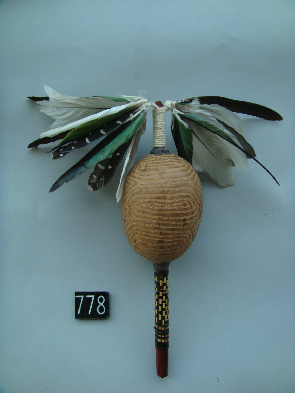 Sonaglio di zucca (lagenaria vulgaris) con manico di legno avvolto in fibra vegetale bicolore il cui intreccio crea un motivo a scacchiera dalla parte dell'impugnatura, mentre l'altra estremità è avvolta con filo di cotone, al quale sono legati due gruppi di 10 penne ciascuno. Le penne sono bianche, marroni e verdi. La zucca é incisa specularmente sui due lati con tre motivi sovrapposti concentrici con stretto rettangolo centrale che nell'ultimo giro richiama un esagono, creando lateralmente spazi riempiti da incisioni che si inseriscono a cuneo triangolari e concentriche.