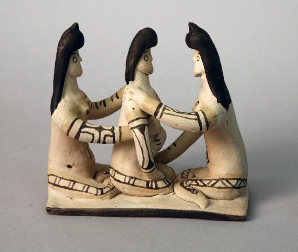 Scena realizzata in modellato plastico con argilla di pasta media fine con inclusi invisibili: due donne sono sedute ai lati di una donna gravida inginocchiata e la assistono nel parto, con il braccio sinistro sulla spalla ed il destro sul ventre. Presentano capelli, occhi e pittura corporale di colore nero. L'acconciatura delle due assistenti è appuntita, con capelli più lunghi della partoriente, il cui petto reca un rettangolo con quattro punti interni. Sulle braccia una linea verticale ne presenta all'interno un'altra con due triangoli laterali, il tutto delimitato da due linee orizzontali. I motivi delle gambe, identici a quelli della prima figura femminile, sono costituiti da due linee parallele verticali suddivise in sei segmenti da sei doppie linee orizzontali. La terza reca due diagonali doppie all'interno. La prima figura laterale reca sul petto un rettangolo al cui interno è presente una sottile linea verticale con due triangoli all'estremità . Sulle braccia, delimitata da due linee orizzontali, è presente una croce con una croce interna, alle cui estremità e centro sono presenti triangoli pieni. La seconda figura laterale ha sul petto due motivi a v e un rettangolo. Sulle braccia, fra due linee orizzontali, sono presenti due linee verticali attraversate da diagonali.