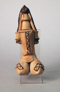 - NOTIZIE STORICO CRITICHE oggetto prodotto all'interno di un gruppo di etnia Karajà risiedente nello stato di Goias in Brasile come appare nella documentazione di accompagnamento alla collezione. Questo tipo di rappresentazione antropomorfa karajà, che si avvale di un repertorio iconografico che attinge al linguaggio della pittura corporale, costituisce una espressione simbolica dell'appartenenza tribale, che indica sesso, condizione sociale e fascia di età dell'individuo rappresentato. Ha funzione ludica e commerciale, in seguito alla convivenza forzata con la società nazionale e internazionale dei turisti. Questa figurina fittile riprende le originarie figurine isolate in posizione ieratica con tratti sommari e steatopigi della fase antica della produzione di figurine in terracotta (pre 1940), che in seguito subisce una trasfigurazione stilistica a causa dei mutamenti socio-economici che hanno coinvolto la vita del gruppo indigeno ed hanno ampliato l'originaria funzione di identificazione ed orgoglio tribale verso una dimensione economica e di sostentamento.