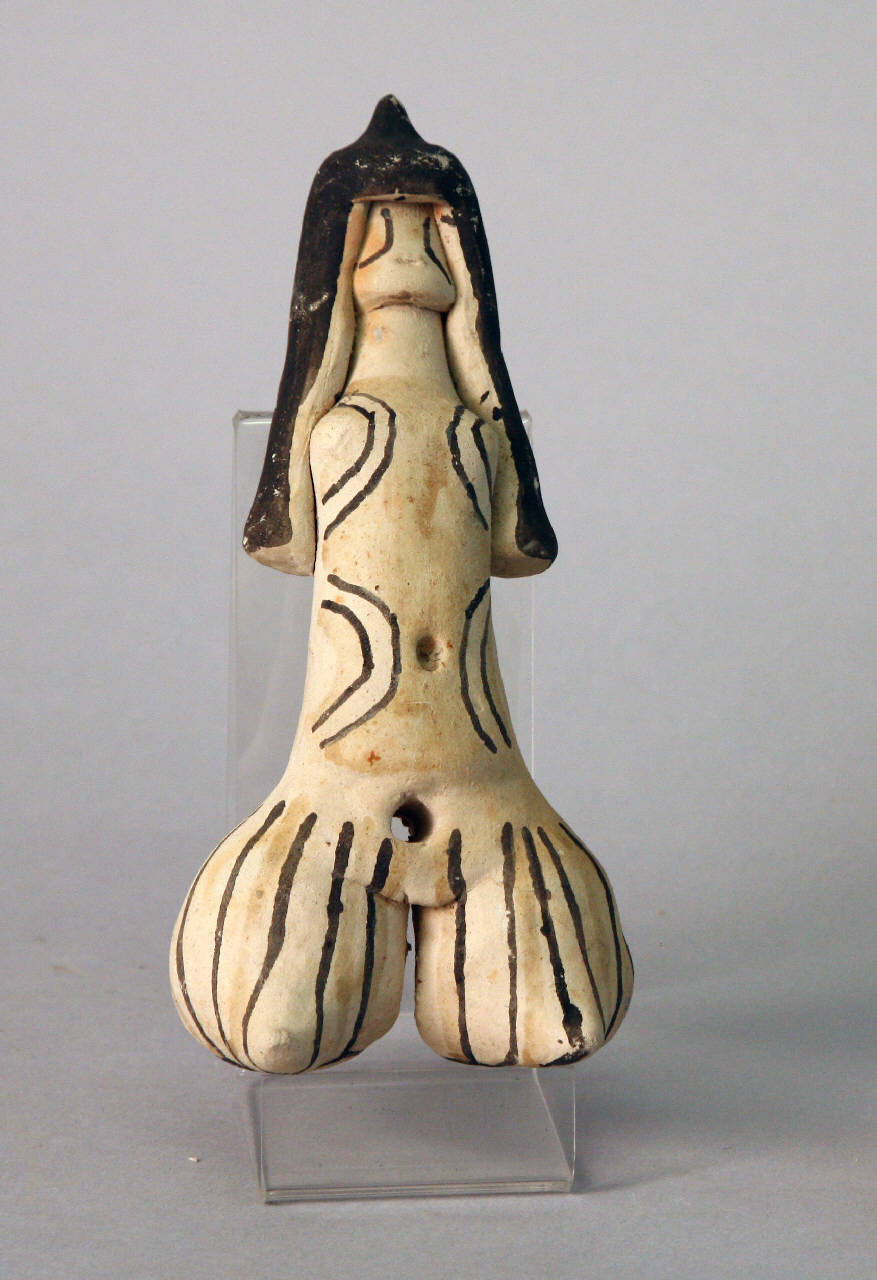Figura femminile accovacciata, senza braccia, in modellato plastico, realizzata con argilla dipinta di bianco, probabilmente con caolino, di pasta mediamente fine con inclusi invisibili. Gli arti inferiori sono ridotti a voluminose masse arrotondate. I lunghi capelli, con acconciatura appuntita, sono dipinti con pigmento nero, lo stesso usato per la pittura facciale e corporale. Ai quattro angoli del tronco sono presenti altrettanti semicerchi doppi, mentre con un foro è indicato l'ombelico. Fra corpo e gambe c'è un foro passante che potrebbe indicare ano e vagina. I motivi sugli arti inferiori sono costituiti da cinque linee verticali per arto, che fanno capo a un cerchio che si trova sotto i rispettivi piedi.Tutti i bordi delle decorazioni sono sottolineati da una riga di colore giallo.