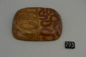 Grande piatto di forma rettangolare a base piana e fondo rialzato. \n?????????interno decorato con una decorazione tripartita. Una metà é decorata con un motivo a volute rosse e uno a volute con perimetro nero e tre linee rosse all'interno, mentre l'altra metà é decorata con un motivo geometrico di linee rosse e nere.\nL'esterno è decorato per metà con il motivo della coda del macaco (ka'iwainyna) e per l'altra metà con il motivo del fagiolo (kumanà).