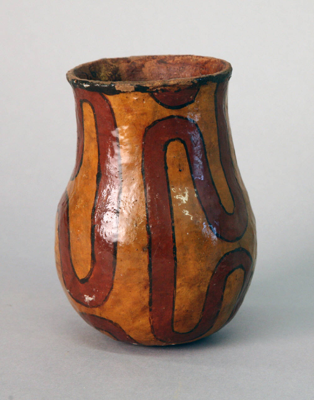 Vaso in terracotta con orlo leggermente estroflesso. L'intera superficie del vaso è decorata con motivi geometrici rossi bordati di nero su fondo di color ocra. L'esterno è verniciato con resina.